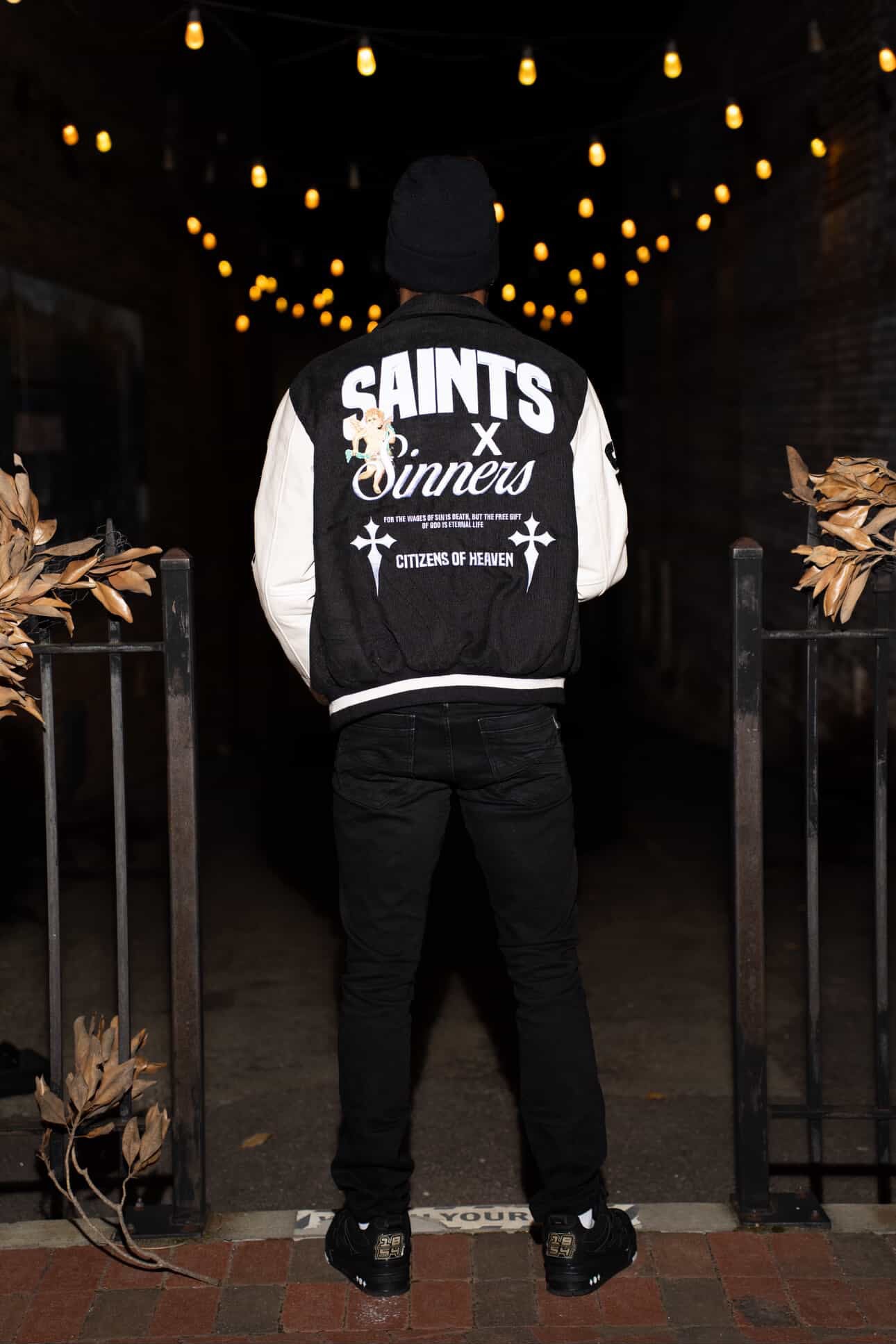 Back Details: Large "SAINTS x Sinners" Typography with Angel graphic and Cross motifs.