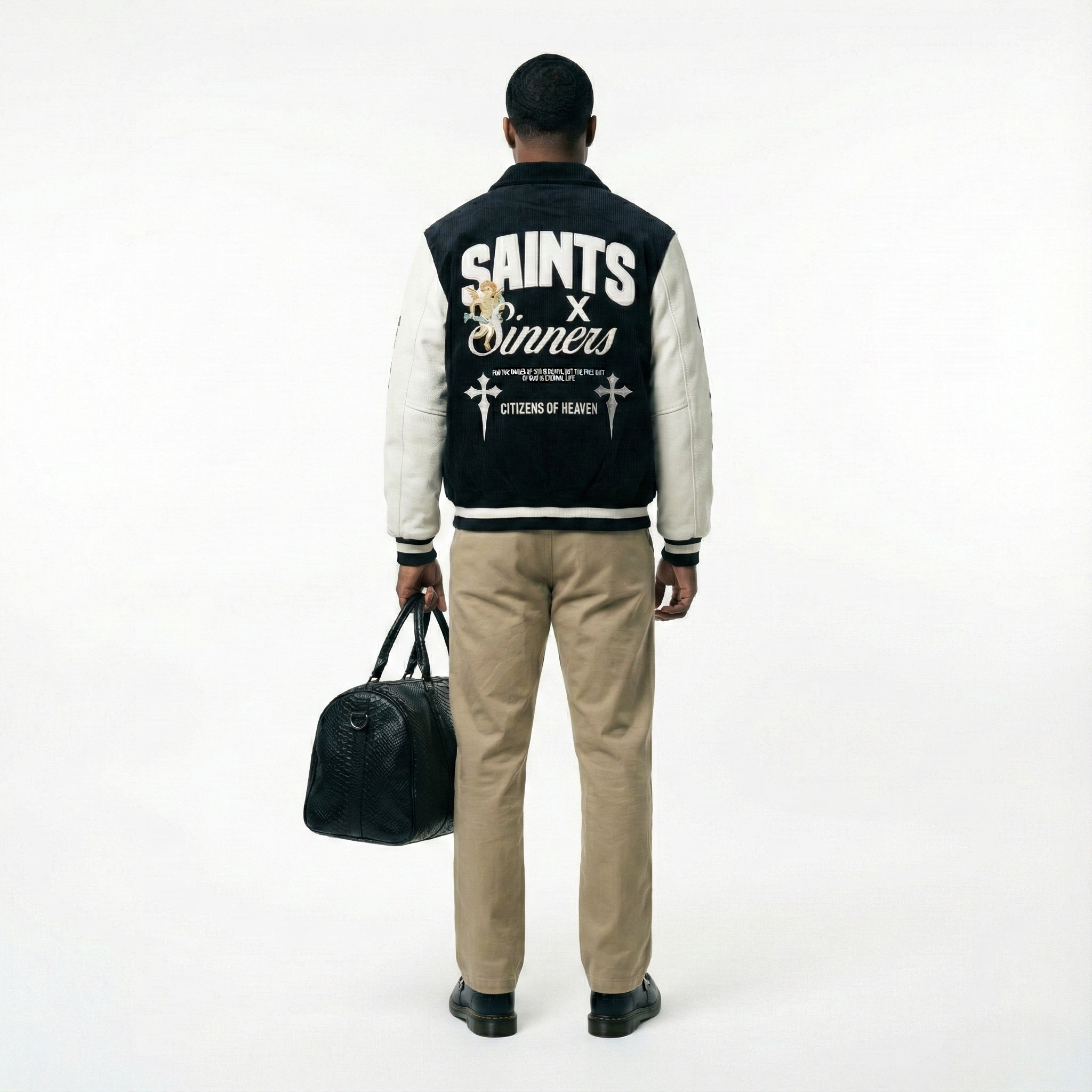 The Saints x Sinners Varsity Jacket The crown jewel of the collection. This heavyweight varsity jacket blends vintage collegiate aesthetics with a profound Kingdom message. Crafted with a premium black corduroy body and contrasting cream leather sleeves, it features bold "Citizens of Heaven" typography down the arms. The chest is detailed with our signature "CH" chenille patch, while the back displays the "Saints x Sinners" motif—an exploration of the believer's redemption story. A timeless silhouette for the modern disciple.
