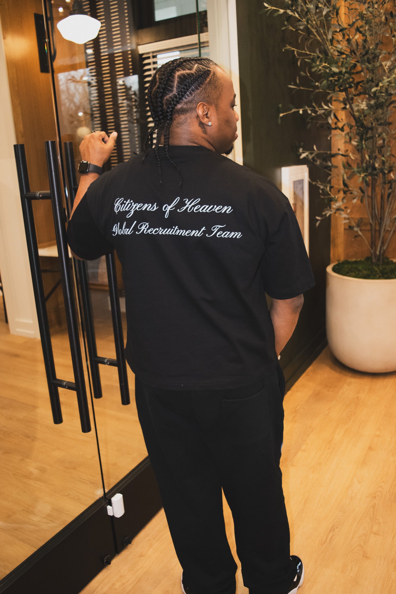 The Crew Boxy Tee: A uniform for the set apart. Cut in a structured, boxy silhouette, this tee features our signature "CREW" branding with halo detailing and the "Not of This World" globe motif on the chest. The reverse highlights the "Citizens of Heaven Global Recruitment Team" in elegant script. Crafted in deep Onyx black, this is sound doctrine meets elevated streetwear.