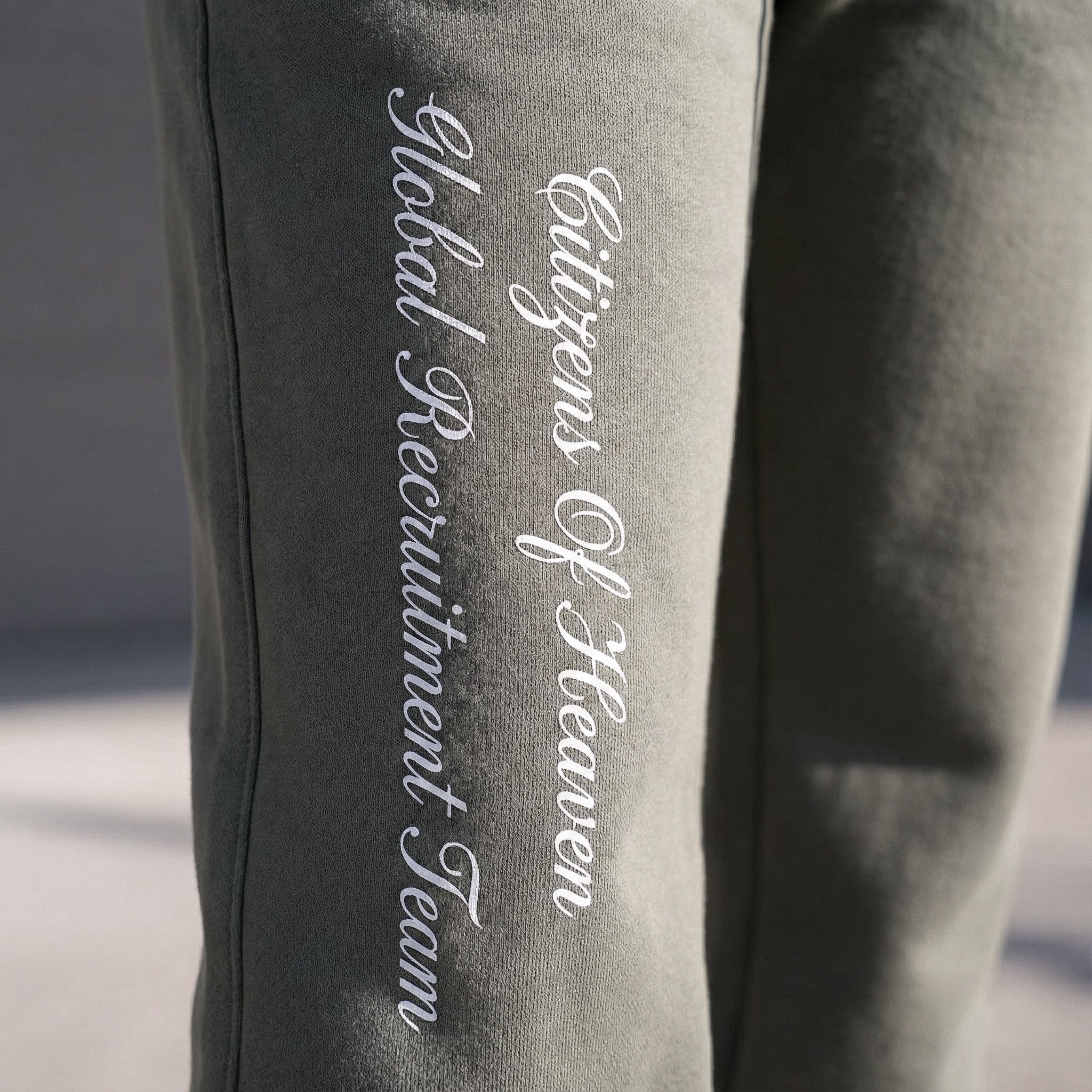 The Crew Sweatpant: Designed for those on the move. These sweatpants in a grayish olive feature a relaxed, straight-leg silhouette engineered for premium comfort. The design is anchored by our "CREW" halo branding on the thigh and the "Not of This World" globe motif. The look is finished with the "Citizens of Heaven Global Recruitment Team" script running vertically down the lower leg—a signature detail for the set-apart.. Perfect for building athleisure looks, casual outings, or laid-back days—these essentials deliver effortless style.