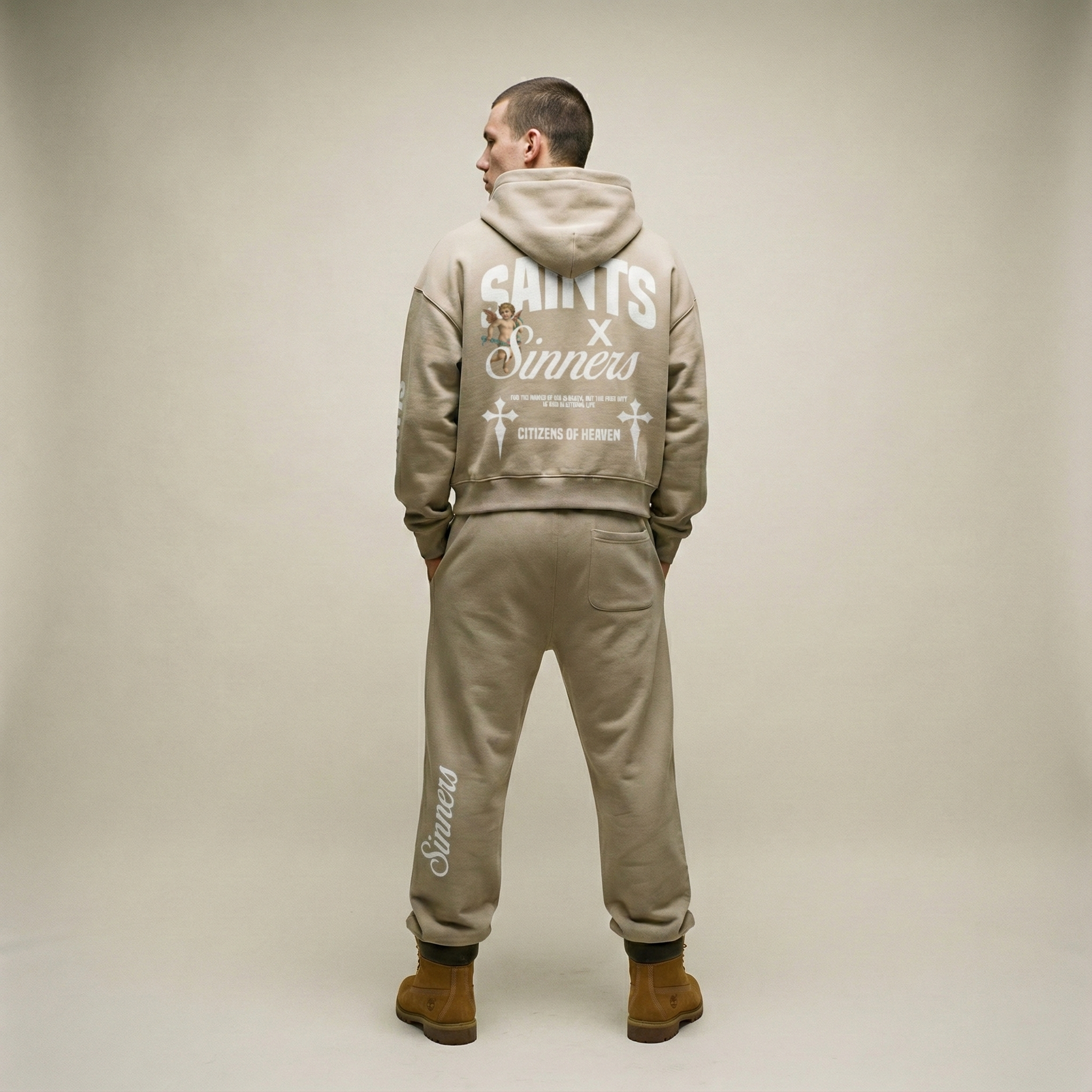 Back Detail: Large-scale "SAINTS X Sinners" typography, scripture verse, and gothic cross accents.